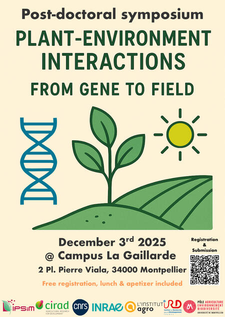 We are pleased to announce the Postdoctoral Symposium on Plant-Environment Interactions: from Gene to Field, which will take place on December 3rd, 2025, at the Agro Institute - La Gaillarde campus in Montpellier.